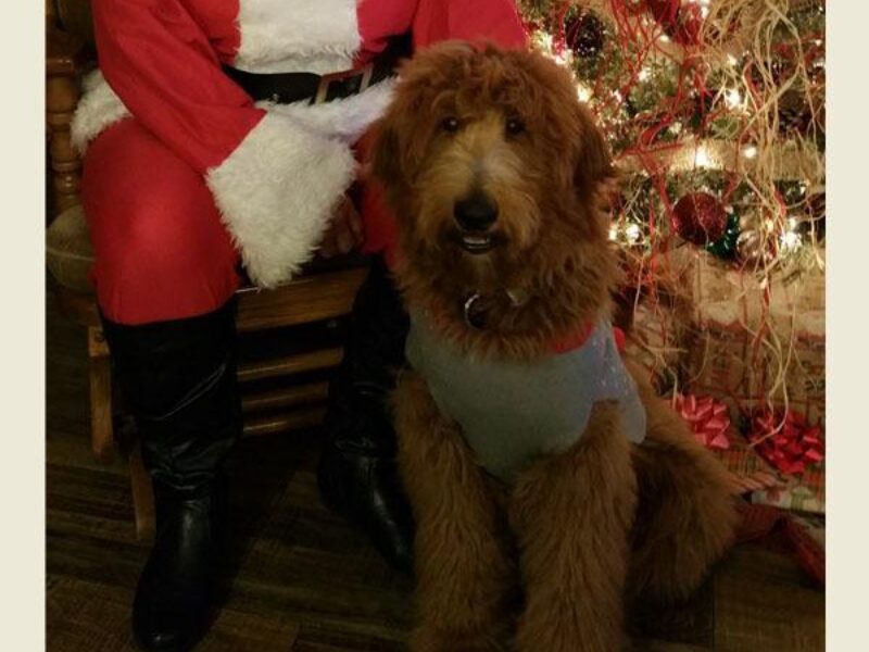 I just wanted to write and give an update on Amigo (Titus). He is growing so fast and he is so smart. He’s one big bundle of energy and loves to get cuddles from everyone and play with all the kiddos that come to visit. He’s a great protector already and he’s in obedience training now which he loves cause he knows he’ll get treats for being good. He will be seven months old on Dec.13. Thank you so much for raising such good loving doodles. We love our Titus soooo much! Here is a pic of him wearing his CHRISTmas pajamas and sporting his new CHRISTmas sweater.
